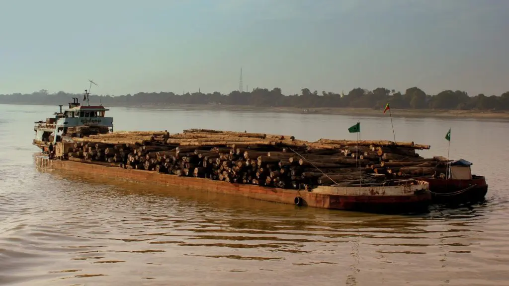 Barco transporta toras de madeira em Mianmar, fevereiro de 2013 (Foto: Wikimedia Commons)